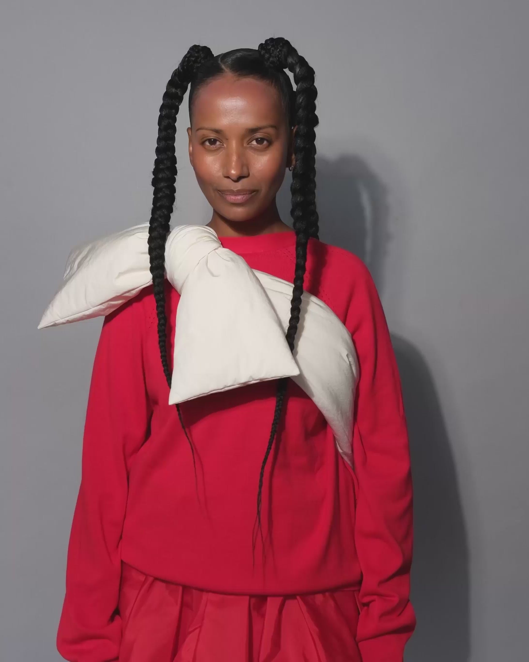 The Amanda Bag is made from lightweight cream material with recycled, deadstock lining. It can be worn crossbody or on the shoulder thanks to its long, outstretched arms that hug the body and meet in an irresistible and unmistakable PHOAF bow.